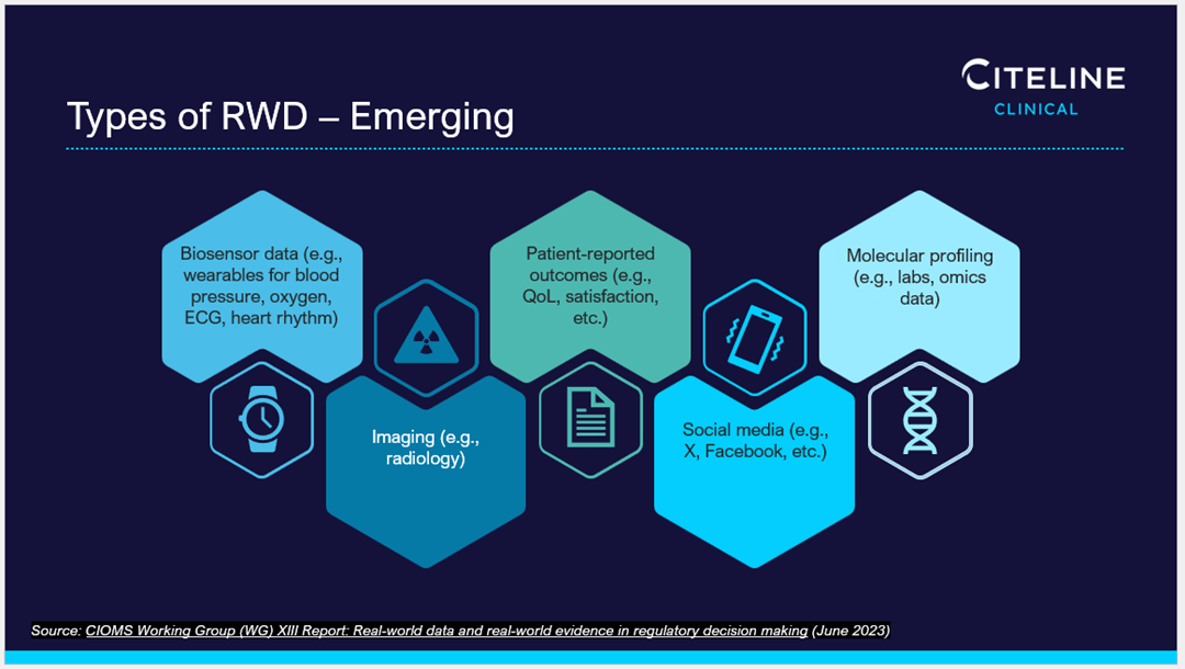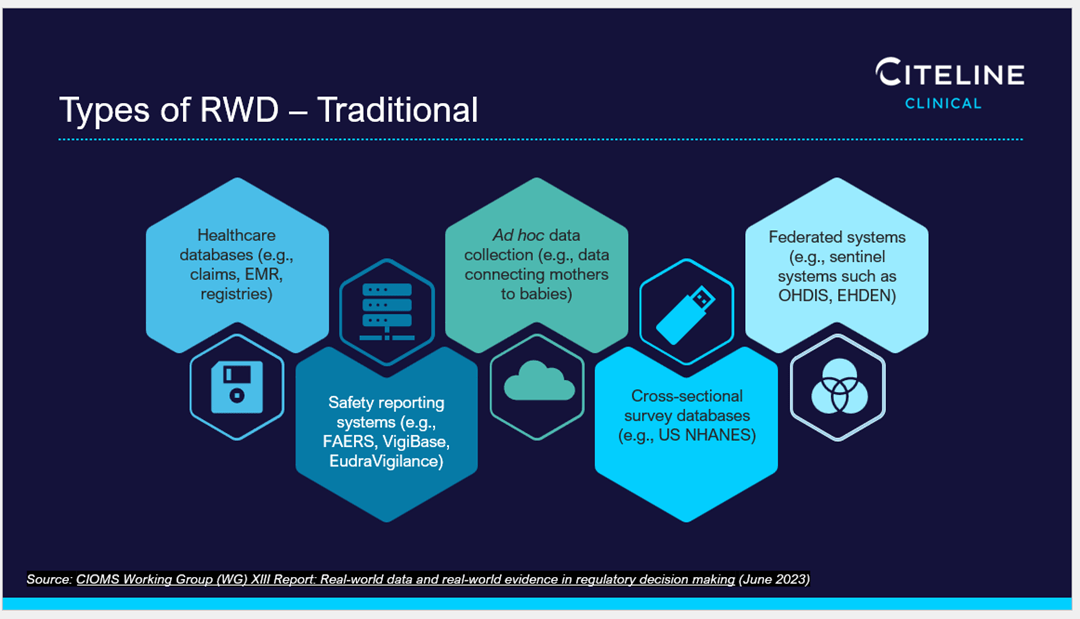 He said that at a very high level, RWD can be bucketed into traditional vs. emerging. Traditional RWD includes claims databases, safety reporting systems, federated systems, cross-sectional survey databases and more. Emerging RWD includes data from wearables, patient-reported outcomes, imaging, molecular profiling labs, etc. “All of this data is out there in the ether.” Emerton cautioned that regulators such as the FDA, the MRHA, and EMA are watching closely.